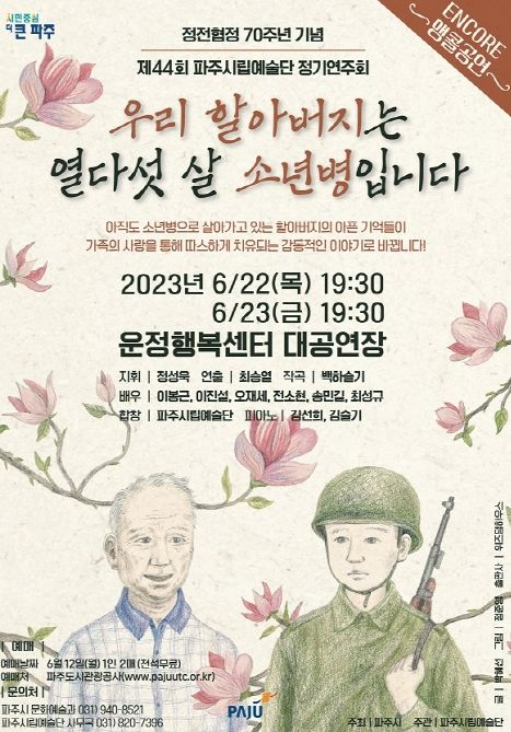 미디어라이프 중부신문 정호복 기자 | 파주시는 6월 22일부터 23일까지 운정행정복지센터 대공연장에서 ‘우리 할아버지는 열다섯 살 소년병입니다’ 공연을 2회에 걸쳐 개최한다.