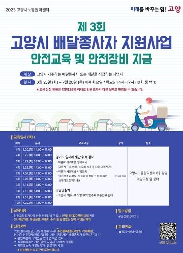 고양시노동권익센터는 고양시노동권익센터 및 덕양구청에서 10회에 걸쳐 안전교육을 운영한다. 배달종사자는 원하는 날짜에 교육을 신청하여 이수하면 된다.