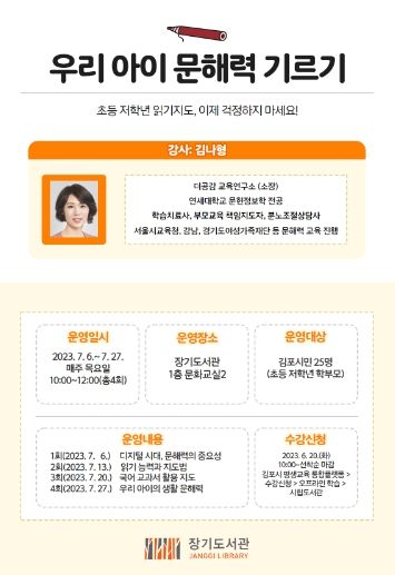 미디어라이프 중부신문 정호복 기자 | 김포시 장기도서관은 7월 6일부터 27일까지 매주 목요일 오전 10시부터 ‘우리 아이 문해력 기르기’ 수업을 진행한다.