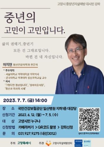 미디어라이프 중부신문 정호복 기자 | 고양특례시 일산동구보건소 고양시자살예방센터는 2023년 7월 7일 오후 2시부터 국민건강보험공단 일산병원 지하1층 대강당에서 중장년 대상 강좌 ‘중년의 고민이 고민입니다’를 개최한다.