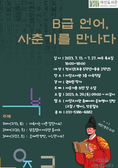 마산도서관의 KDC 인문학 기행 언어편 ‘B급 언어, 사춘기를 만나다’는 사춘기를 위한 말 수업으로, 청소년이 사용하는 비속어와 자주 틀리는 맞춤법을 알아보는 교육 프로그램이다.
