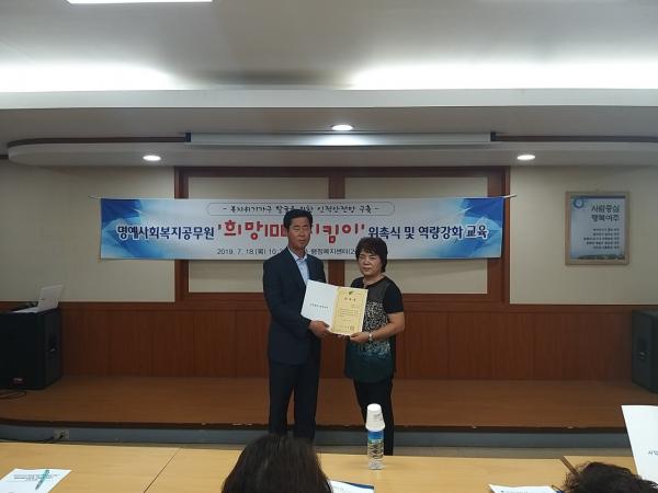 남신우 가남읍장은 “우리 이웃을 위한 명예사회복지공무원분들의 적극적인 참여에 감사드리며 희망천사지킴이의 활약을 바탕으로 마을마다 위기 가정 없는 행복한 가남을 만들어 가는데 함께 노력하자”고 말했다.