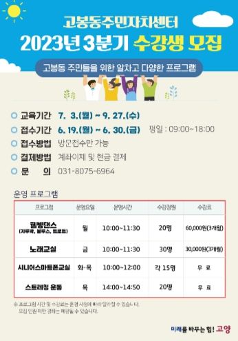미디어라이프 중부신문 정호복 기자 | 고양특례시 고봉동 주민자치회가 오는 6월 19일부터 30일까지 2023년 3분기(7월 ~ 9월) 주민자치센터 문화강좌 수강생을 모집한다고 밝혔다.