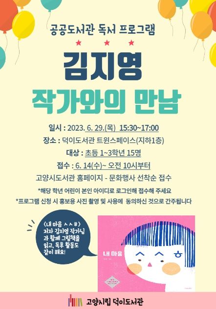 도서관 관계자는 “초등학교 저학년 어린이들이 그림책 작가와 함께 책을 읽고 이야기 나누며 자신의 마음을 알고 표현하는 방법을 배우는 유익한 시간이 되기를 바란다” 고 말했다.