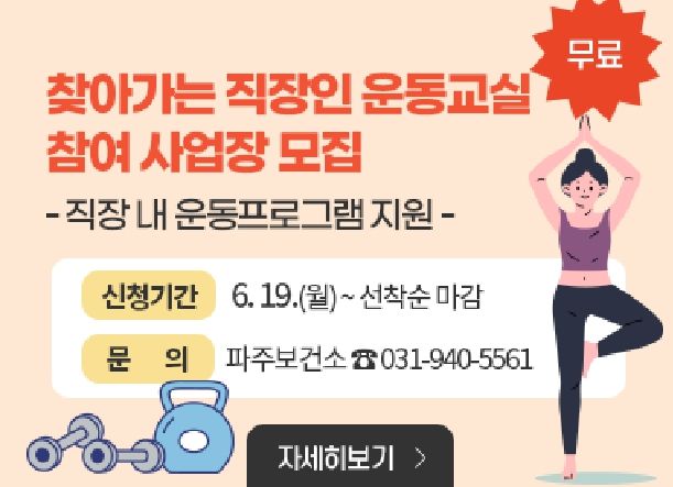 미디어라이프 중부신문 정호복 기자 | 파주보건소는 ‘찾아가는 직장인 운동교실’에 참여할 사업장 2곳을 6월 19일부터 선착순으로 모집한다.