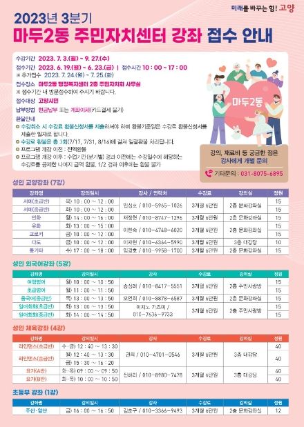 미디어라이프 중부신문 정호복 기자 | 고양특례시 마두2동 주민자치회는 2023년 3분기 주민자치센터 문화강좌 프로그램 수강생을 모집한다고 19일 밝혔다.