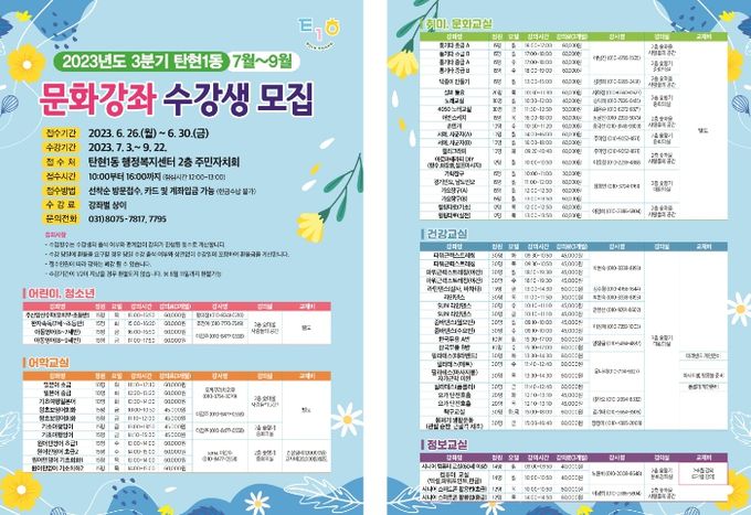 문화강좌는 오는 6월 26일부터 탄현1동 행정복지센터 2층 주민자치회실에서 접수를 받으며, 7월 3일부터 프로그램 운영을 시작한다.