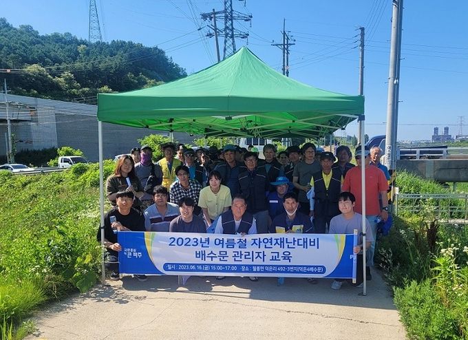 이번 교육은 배수문 관리자 및 풍수해감시인, 하천지킴이 등을 대상으로 진행했으며, 강우 시 상시 순찰 강화 및 전원 차단 등 비상시 수동 개폐조작이 가능하도록 하는 데 중점을 두고 실시했다.