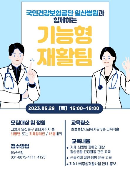 미디어라이프 중부신문 정호복 기자 | 고양특례시 일산동구보건소는 오는 6월 29일 '기능형 재활팀'의 일환으로 국민건강보험공단 일산병원과 연계하여 뇌병변·지체 장애인을 대상으로 재활 교육을 실시한다.