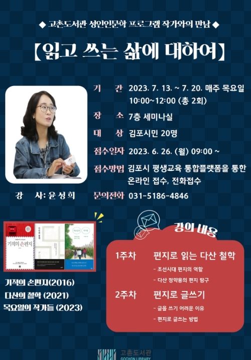 미디어라이프 중부신문 정호복 기자 | 김포시 고촌도서관은 오는 7월 13일과 20일 두 차례에 ‘읽고 쓰는 삶에 대하여’ 프로그램을 운영한다.
