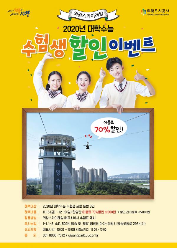 이벤트에 참여하기 위해서는 수능 다음 날인 11월 15일부터 12월 15일까지 의왕 레솔레파크 내에 있는 의왕스카이레일 이용 시 수험표를 지참하면 70% 특별 할인을 적용받아 동반 3인까지 4,500원에 이용할 수 있다.