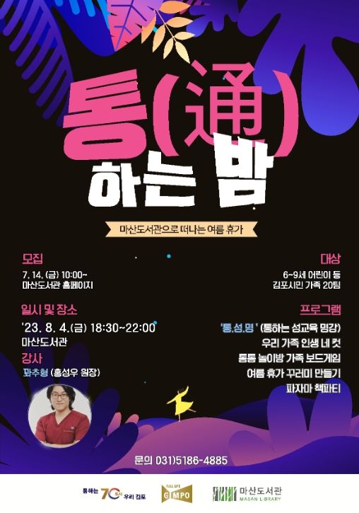 ‘통(通)하는 밤’은 마산도서관에서 보내는 여름밤 북캉스로 그 대상은 6~9세 어린이 및 김포시민 가족 20팀이다.