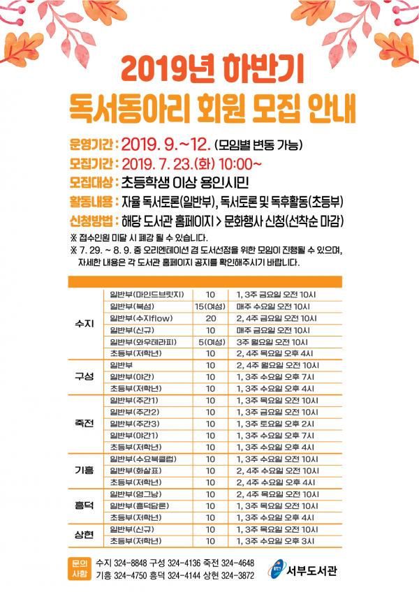 수지 · 구성 · 죽전 · 기흥 · 흥덕 · 상현 등 서부지역 도서관 6곳은 23일부터 8월 7일 22개 동아리에서 활동할 일반부 170명, 초등부 60명의 회원을 모집한다.