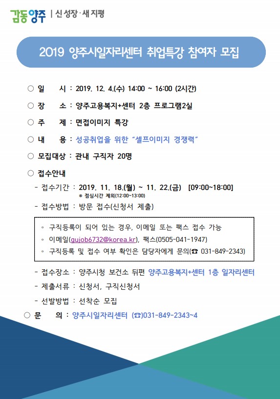 이번 취업특강은 ‘성공취업을 위한, 셀프이미지 경쟁력’을 주제로 양주고용복지센터 2층 프로그램실에서 오후 2시부터 2시간동안 진행할 예정이다.
