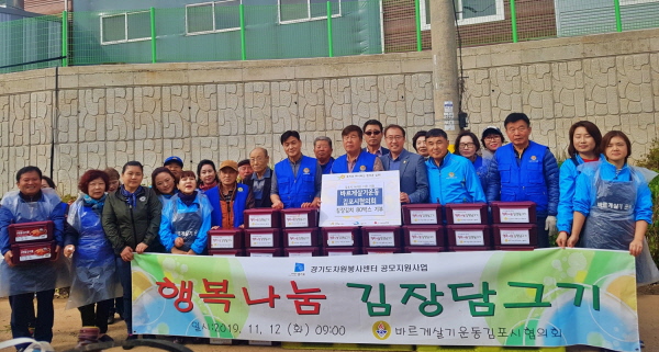 이날 전달식에는 현영수 바르게살기운동김포시협의회장, 이병우 김포복지재단 대표이사 및 관계자들이 참석해 바르게살기운동김포시협의회 회원들과 함께 담근 김장김치 80박스를 김포복지재단을 통해 드림스타트 30가정, 보건소 50가정에게 전달했다.