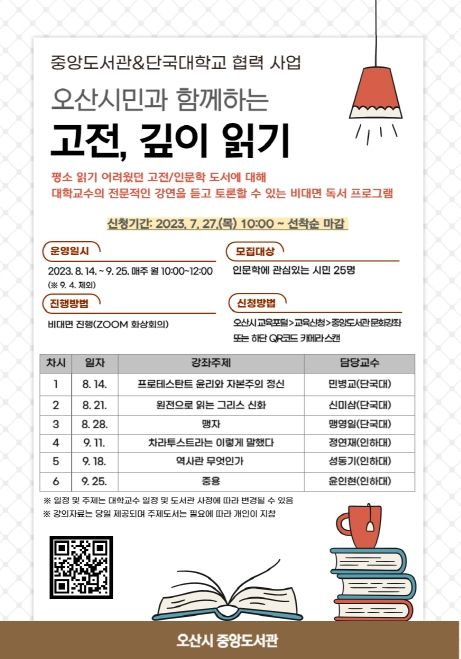 한현 오산시도서관장은 “2021년부터 시작된 고전, 깊이 읽기 프로그램이 벌써 3년 차를 맞았다. 바쁜 하루를 살아가는 요즘이야말로 인문학의 힘을 통해 스스로 사고하는 힘과 인간다움을 필요한 때이다. 시민들이 이번 강좌를 통해 문화적 갈증을 해소하고 독서의 즐거움과 많은 배움을 얻었으면 좋겠다”라고 전했다.