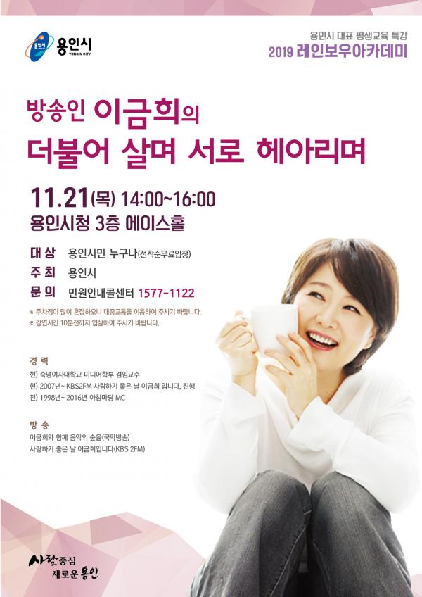 [미디어라이프(medialife)] 용인시는 오는 21일 시청 에이스홀에서 시민을 위한 무료강좌인 ‘레인보우 아카데미’의 11월 행사로 방송인 이금희씨의 특강을 연다.