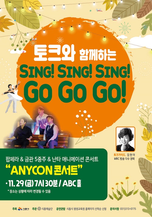 ‘토크와 함께 하는 Sing Sing Sing, Go Go Go’는 ABC행복학습타운 공간 활성화와 지역민들의 세대간 공감 가능한 문화예술에 대한 감성 확산을 위한 ‘소래산 감성배움터’의 프로그램의 일환이다. 본 공연은 ‘시흥예술단’에서 주관해 추진하고 있으며 남녀노소 누구나 즐겁게 관람 가능하다.
