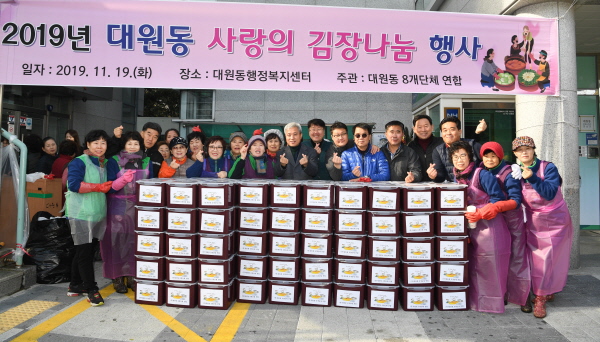 김문배 대원동장은 “추운 날씨 속에 김장행사에 참여한 8개 단체 회원들에게 감사하다”며 “기나긴 겨울 먹거리를 걱정해야 하는 저소득층에게 이웃사랑의 온정을 전해 따뜻한 겨울을 날 수 있기를 바란다”고 말했다.