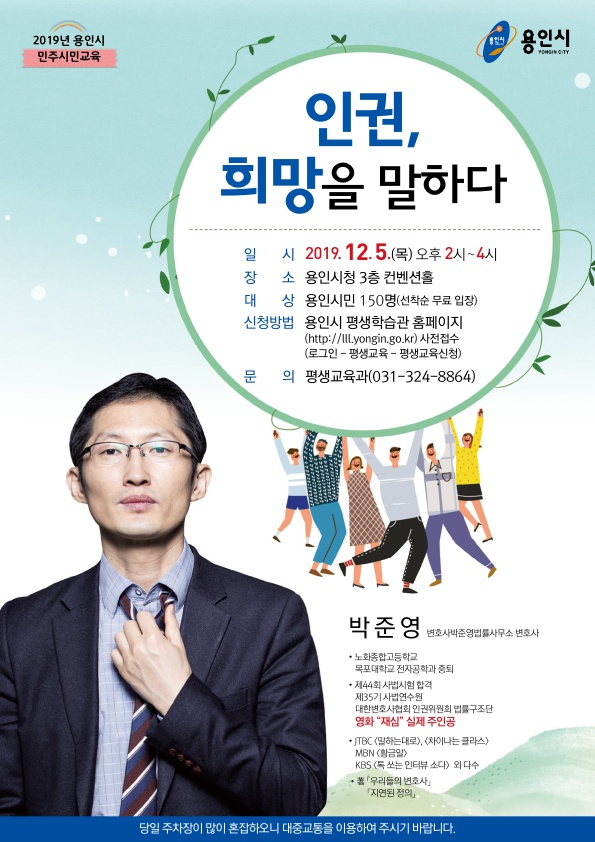 12월5일 시청 컨벤션홀에서 열리는 이 행사는 박 변호사의 ‘인권, 희망을 말하다’라는 주제 강연과 박영주 민주시민교육위원회 위원장 진행의 토크 콘서트로 구성됐다.