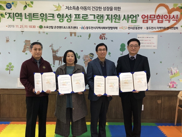 [미디어라이프(medialife)]동두천시는 지난 21일 소요산탑온천랜드에서 시 복지정책과장, 지역사회보장 실무협의체위원장 등 관계자 30여명이 참석한 가운데 저소득층 아동을 위한 지역네트워크형성 프로그램지원 사업 업무 협약식을 개최했다.