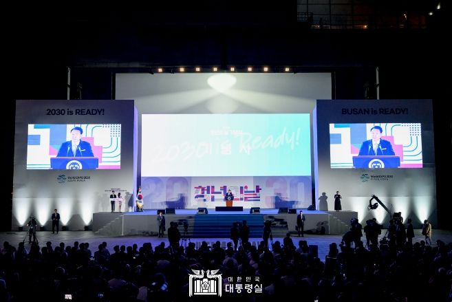 대통령은 이어서 참석자들과 함께 응원수건을 높이 들고 “2030 is Ready”라고 외치는 퍼포먼스를 통해 부산 세계엑스포 유치에 대한 강한 의지를 밝혔다.