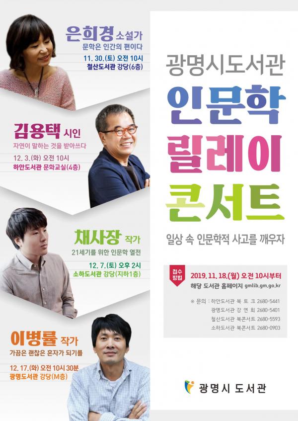 인문학 릴레이 콘서트 첫 번째 순서는 철산도서관으로 11월 30일 토요일 오전 10시 ‘문학은 인간의 편이다’ 를 주제로 은희경 소설가와 함께 북 콘서트를 연다.