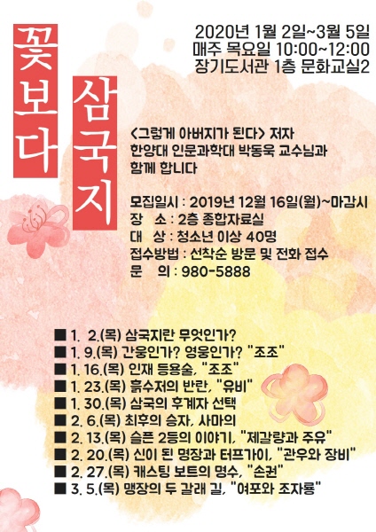 [미디어라이프(medialife)] 김포시 장기도서관은 오는 2020년 1월 2부터 3월 5일까지 매주 목요일 오전 10시부터 오후 12시까지 문화교실에서 총 10회에 걸쳐 ‘꽃보다 삼국지’ 특강을 진행한다.