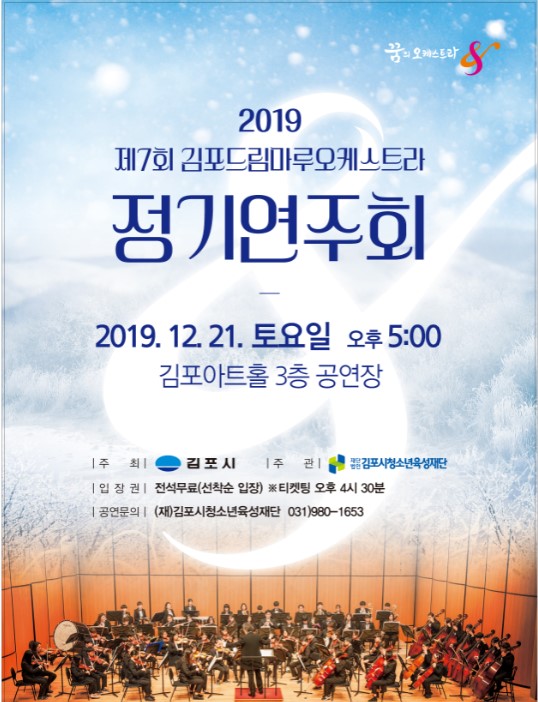 이번 김포드림마루 오케스트라 정기연주회는 전석 선착순 무료로 누구나 관람 할 수 있으며 연말을 맞아 청소년과 시민들에게 서정적이고 감동적인 음악을 선사할 것으로 기대되고 있다.