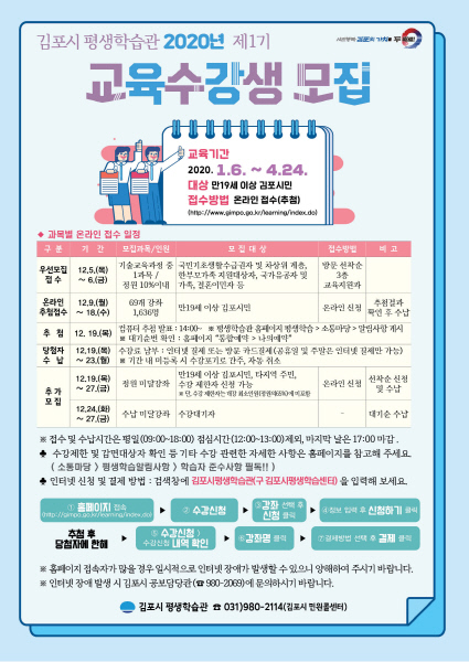 일반모집은 만 19세 이상 김포시민을 대상으로 오는 9일부터 전 과목 온라인 접수를 실시하며 정원 미달 과목 등 추가모집 기간에는 타 지역 주민 및 수강 제한자도 신청이 가능하다.