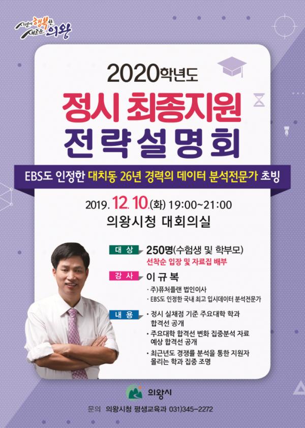김상돈 의왕시장은“이번 설명회는 2020학년도 정시 대입전략을 효과적으로 수립하는데 필요한 정보를 얻을 수 있는 좋은 기회가 될 것”이라며“대입 전략에 어려움을 겪고 있는 학생과 학부모들의 많은 관심과 참여를 바란다”고 말했다.