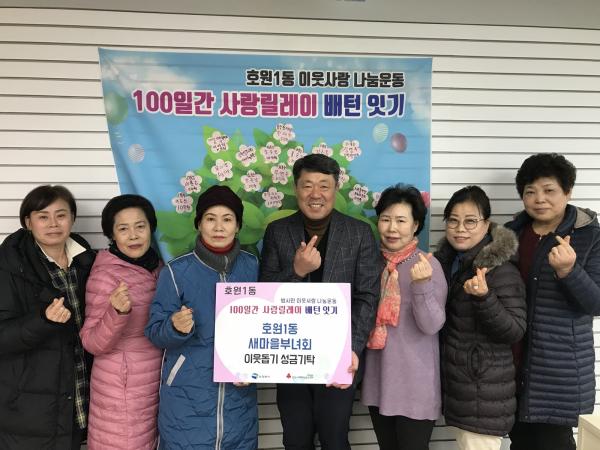 호원1동 새마을부녀회는 김장나누기 행사 참여 등 다양한 봉사활동을 비롯해, 매년 100일간 사랑의 릴레이 배턴 잇기 운동에 참여하고 있다.