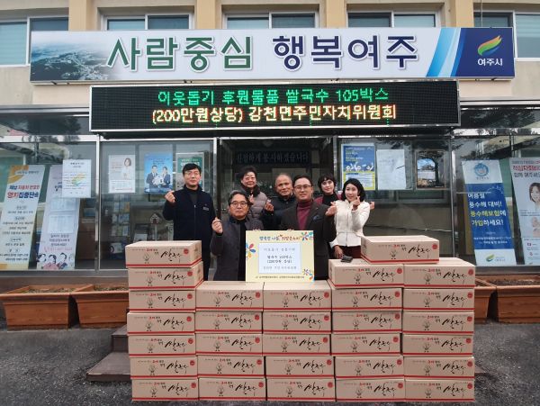 주민자치위원회는 지난 달 15일 주민자치센터 동아리 프로그램 발표회를 진행하면서 불우이웃돕기 바자회도 함께 진행했으며 이 때 마련한 뜻깊은 수익금으로 약 210만원 상당의 쌀국수 105박스를 구입해 강천면 행정복지센터에 기탁한 것이다.