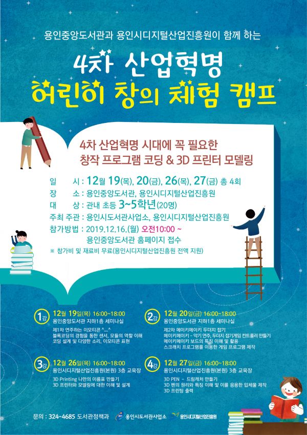 참가자들은 용인중앙도서관·용인시디지털산업진흥원에서 19·20·26·27일 4회에 걸쳐 초보자용 블록코딩으로 이모티콘과 소리 등을 만들고 스크래치 프로그램을 활용해 악기연주 컨트롤러를 만들게 된다.