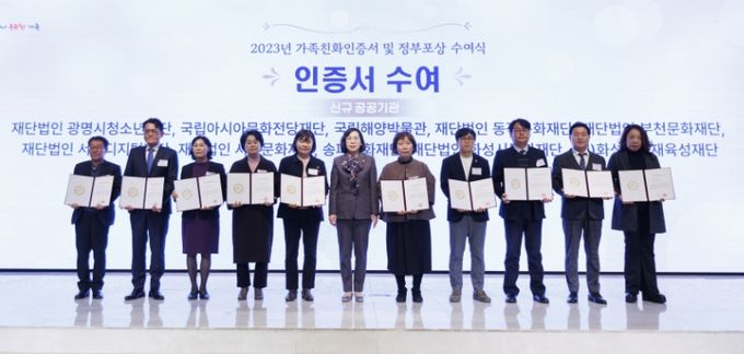 여성가족부는 지난 19일 오후 3시 서울 종로구 HW컨벤션에서 '2023년 가족친화인증서 및 정부포상 수여식'을 개최했다. 이날 수여식에서는 '2023년 가족친화 우수기업'으로 선정돼 표창을 받는 18개 기업, 장기간 가족친화인증을 유지하고 있는 10개 최고기업, 신규인증기업에 대해 표창 및 인증서를 수여하고, 우수사례 발표를 통해 각 기업의 가족친화경영 노하우도 공유했다.