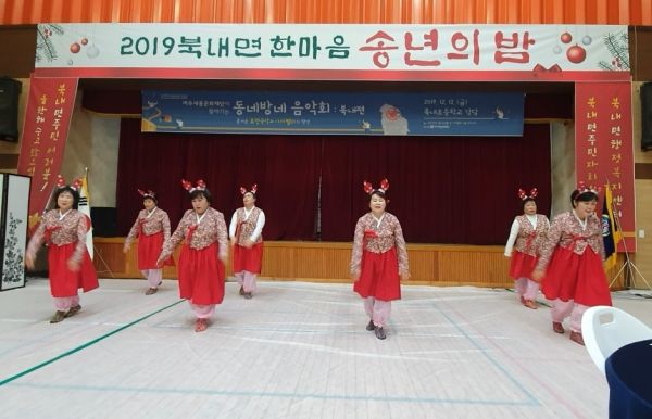 2019 북내면 한마음 송년의밤은 주민자치 동아리인 난타동아리가 준비한 신명나는 식전공연에 이어 기념식, 초청공연 동네방네음악회, 동아리 발표회, 면민화합의 시간 순으로 이어졌으며 기념식에서는 북내면 지역 발전 및 의정발전에 힘쓴 주민자치위원등 7명의 주민에게 상장 및 감사패등이 수여됐다.