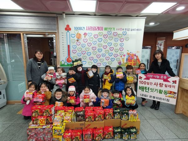 윤경숙 은행어린이집 원장은 “작은 도움이지만 어려운 이웃에게 큰 용기와 희망이 될 수 있다는 마음으로 즐겁게 참여했다”며 “앞으로도 어려움을 겪으며 소외된 계층에게 따뜻한 손길이 미칠 수 있도록 최선을 다하고 우리 아이들이 따뜻한 마음을 가진 어린이로 성장할 수 있도록 교육하겠다”고 밝혔다.