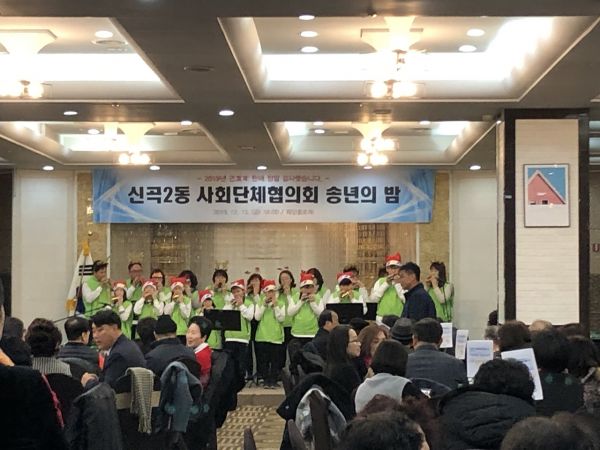 주민자치위원의 진행으로 시작된 합동송년회는 신곡2동 청소년지도협의회 회원 및 관내 청소년들의 아름다운 오카리나 합주를 시작으로 신곡2동 12개 단체에서 헌신적으로 봉사하신 회원에게 감사패 전달, 신곡2동 새마을지도자회 회장의 사회로 노래자랑 등이 펼쳐져 화기애애한 분위기 속 한 해를 마무리하는 뜻깊은 행사가 진행됐다.