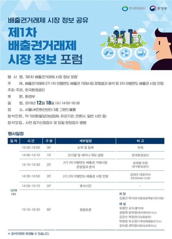 12월 18일 열리는 제1차 행사에서는 배출권거래제 2기 1차 이행연도 배출권 거래시장 운영결과 분석 2기 2차 이행연도 배출권 시장 전망 등에 대해 논의한다.