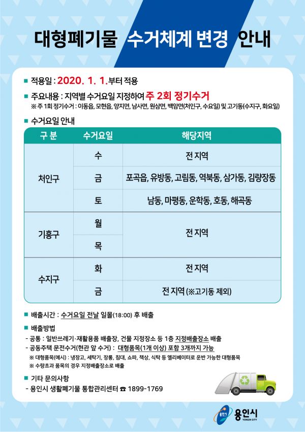 내년부터 처인구 포곡읍·유방동·역북동·삼가동·김량장동·고림동은 월·수요일에, 마평동·남동·운학동·호동·해곡동은 수·토요일에 대형폐기물을 수거한다. 기흥구는 월·목요일 수지구는 화·금요일에 대형폐기물을 수거한다.