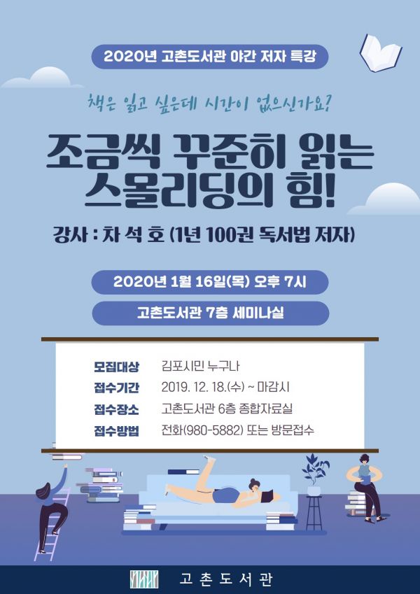 이번 강연은 누구나 무료로 참여 가능하며 접수는 12월 18일 수요일부터 고촌도서관 6층 종합자료실에서 방문 또는 전화로 신청할 수 있다.