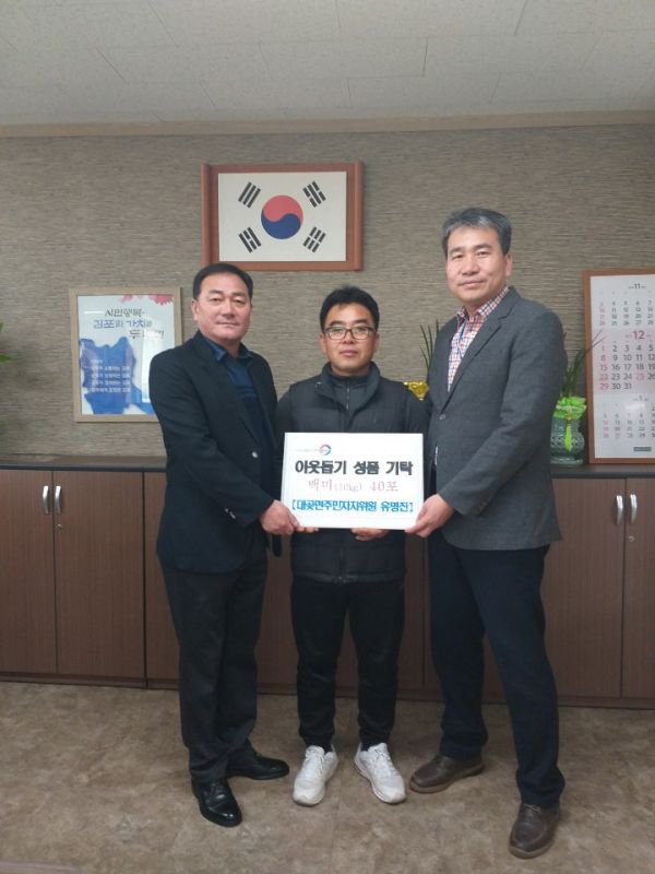 대곶면 주민자치위원회 유명진 위원은 관내 어려운 이웃에게 전달해달라며 직접 농사지은 백미 10kg 40포를 기탁한데 이어 지역주민인 백용인 씨가 백미 20kg 40포를 기탁했다.
