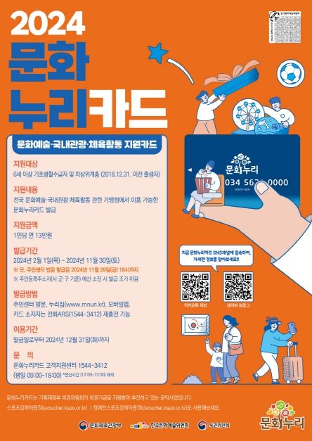 카드 발급은 오는 11월 30일까지 가능하며, 동행정복지센터 또는 문화누리카드 홈페이지를 통해 신청하면 된다. 사용기한은 올해 12월 31일까지이다.