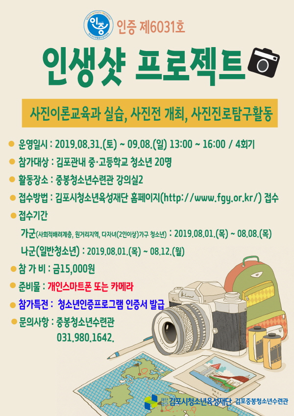 인증 제6031호 ‘인생샷 프로젝트’ 는 청소년들이 일상생활 속에서 스마트폰이나 카메라로 사진을 다양하게 찍으면서 자신의 생각을 표현할 수 있도록 도와주는 프로그램이다.