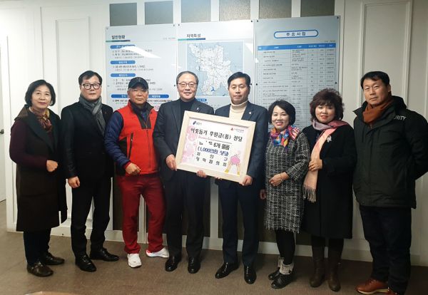 이날 처인구 장학협의회 황선인 회장을 비롯한 회원들이 구청을 찾아와 김장김치 10kg짜리 20박스, 쌀 50포, 가정용소화기 100대 등 1000만원 상당의 물품을 전달했다.