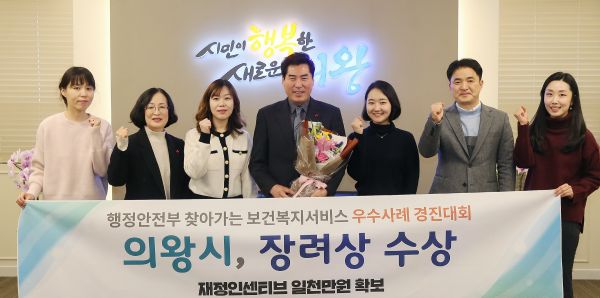 의왕시는 주민의 보건복지 수요증가를 반영한 앞선 행정조직 개편과 복지 및 보건관련 인력확충으로 복지와 주민중심 건강관리서비스를 강화하는 한편 공공서비스 민관 연계·협력체계 활성화 분야에서 높은 평가를 받아 장려상과 함께 재정인센티브 1000만원을 받았다.