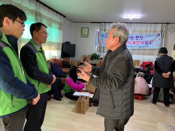 2019년 마지막 찾아가는 복지·보건 현장 상담소는 크리스마스를 더욱 따뜻하게 보내실 수 있도록 어르신들에게 복지 상담과 혈압·혈당 체크, 구강·치매 검사를 실시하고 혹한기에 대비한 건강 유의사항 등의 당부도 함께 해 더욱 의미 있는 시간이 됐다.