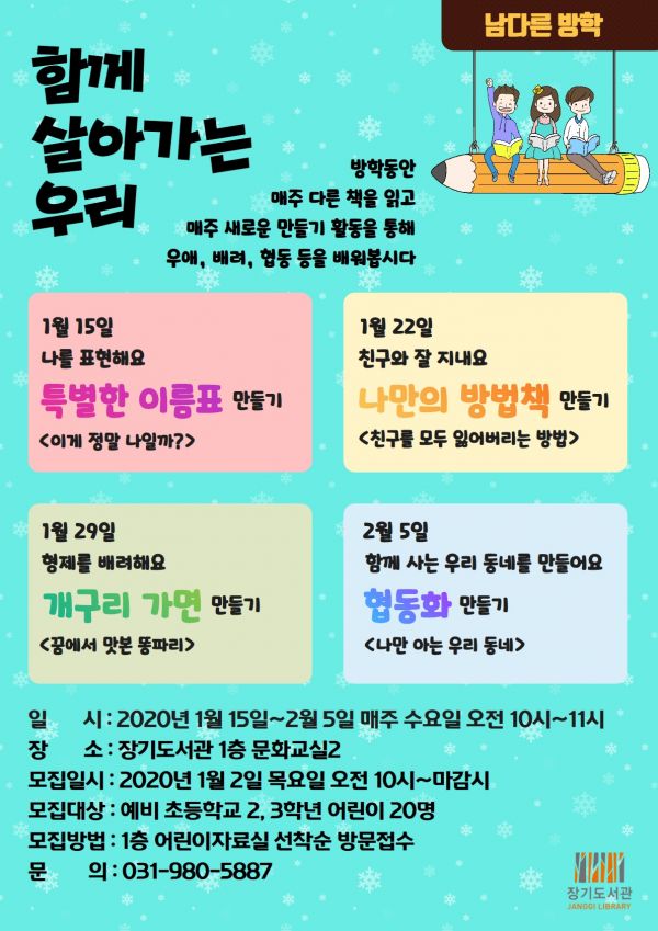 2020년 1월 15일부터 2월 5일까지 매주 수요일 오전 10시부터 11시까지 진행되는 이번 강좌는 동화책을 함께 읽고 다양한 독후활동을 통해 친구간의 우애, 형제간의 배려, 협동 등 민주시민으로서 갖춰야할 가치 의식을 함양하는 기회를 제공한다.