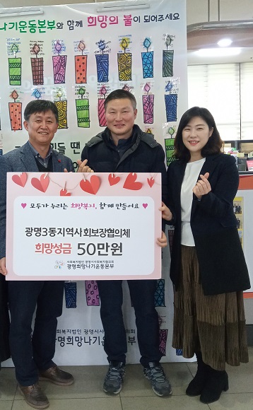 김군채 지역사회보장협의체 위원장은 “시상금을 어려운 이웃을 위해 사용하자는 위원들의 뜻을 모아 기부를 결정했다 앞으로도 꾸준한 활동과 나눔을 실천하며 소외 계층이 없는 광명3동을 만들 수 있도록 더욱 열심히 노력하겠다”고 밝혔다.