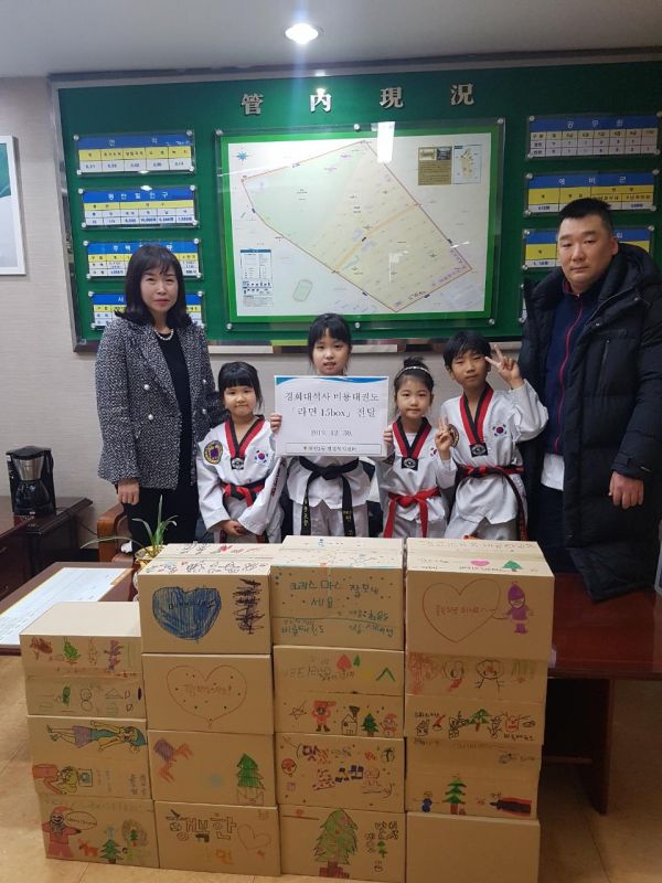 이날 전달한 라면은 어려운 이웃을 돕기 위해 비룡태권도 수련생들이 모은 것으로 예쁜 그림과 함께 전했다.